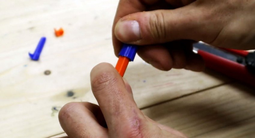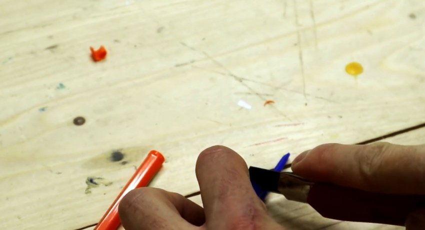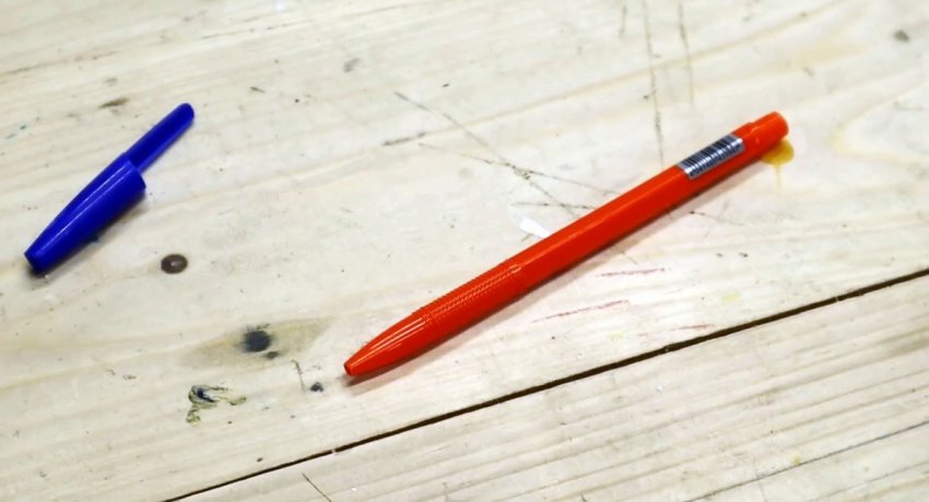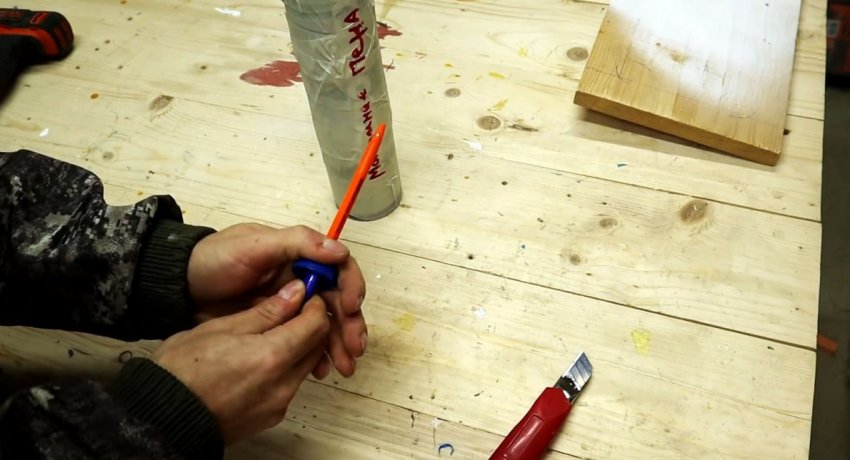 Если нужно запенить пару мелочей, то чтобы не пачкать пистолет, можно сделать его упрощенную версию из шариковой ручки. Для этого из ее корпуса срезается резьба, и на него надевается трубка, вырезанная из центральной части колпачка.