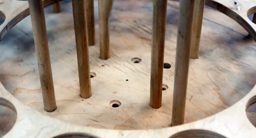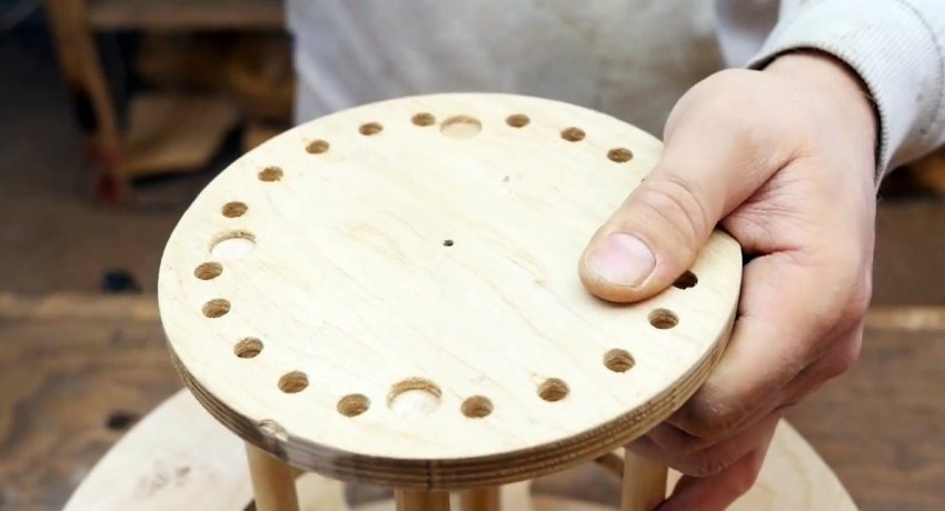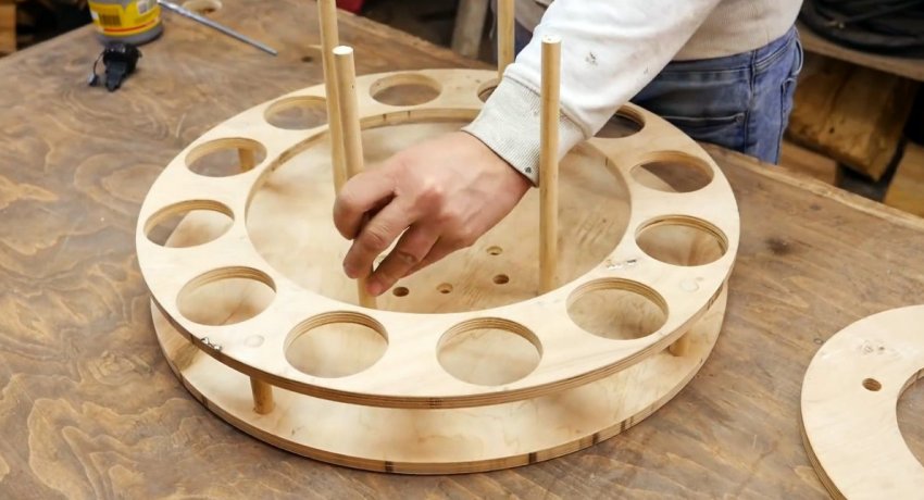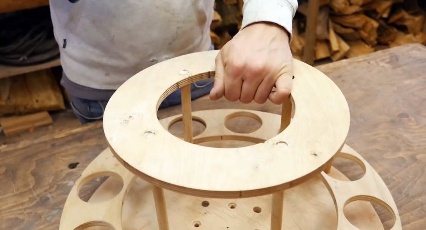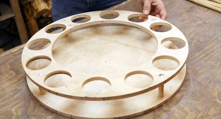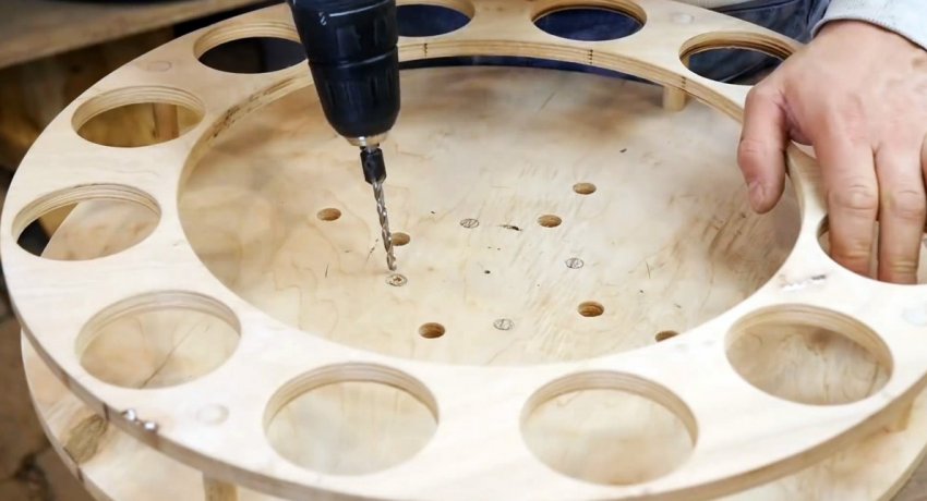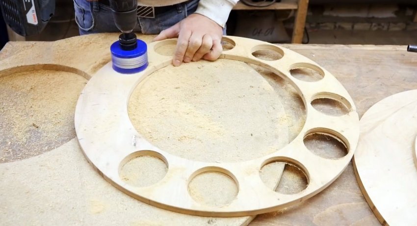 В центре подошвы до закрепления ярусов сверлятся отверстия под установку ступицы. Затем устанавливаются кольцо и диск. По их окружности нужно наделать отверстий под отвертки, сверла, стамески, напильники и прочий инструмент.