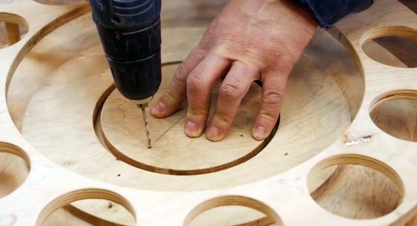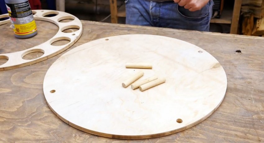 На большой диск выкладываются кольца и центральная часть. После этого делается разметка. Нужно поделить их на секторы. В большем кольце по меткам вырезаются отверстия коронкой под баллончики с краской. Затем нужно соединить большой диск с кольцом, используя 4 шканта из круглого профиля. Они сажаются на клей.