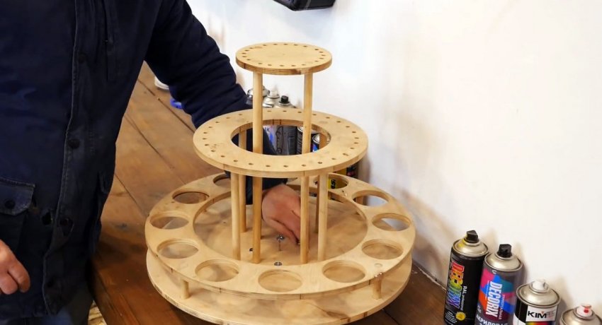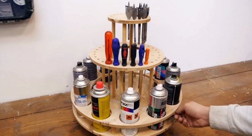 Ступица прикручивается к столешнице. Затем на нее устанавливается органайзер. На его нижний ярус можно выставить краску, аэрозольные смазки, газовые баллоны. Сверху, к примеру, располагаются отвертки, на третьем ярусе можно ставить перьевые сверла.