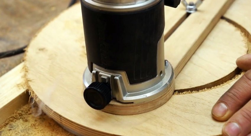Первым делом из фанеры необходимо выпилить 2 больших диска для нижнего яруса. Их диаметр должен быть не больше глубины верстака.