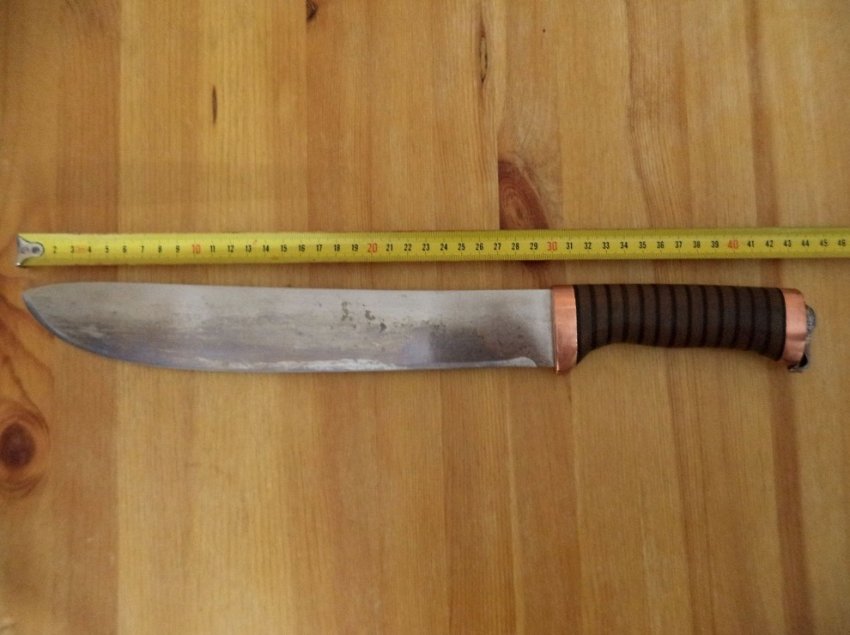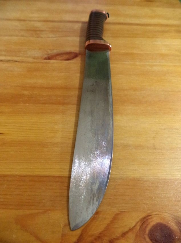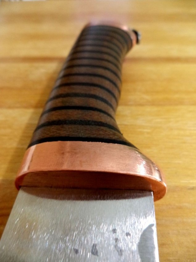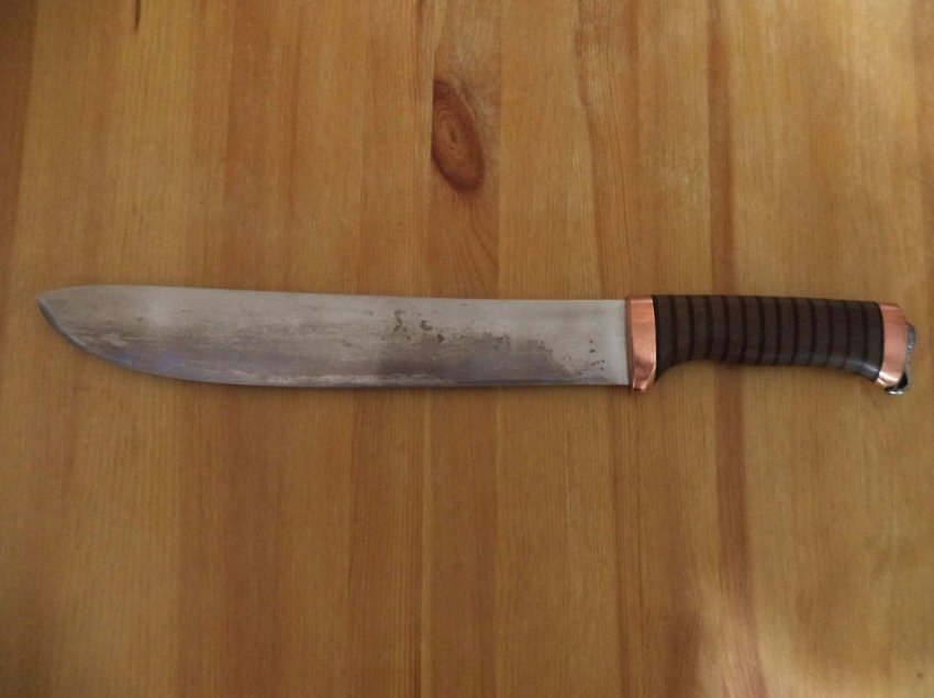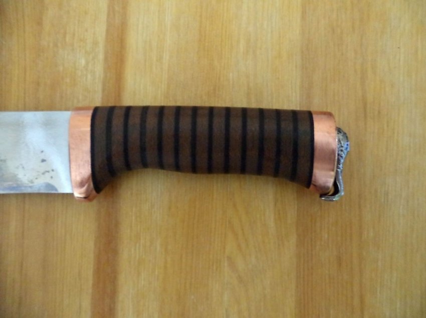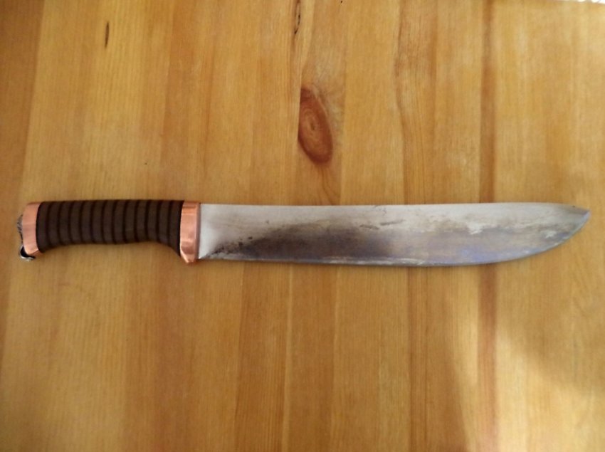 Приветствую всех! Скоро веснище - порище- любвище! Как говорит мой хороший знакомый! А значит рыбалки, походы, шашлыки, вылазки за город! И к знаменованию этих событий изготовил себе "Мачете"! Был у меня остаток мясницкого тесака для разделки туш. Сталь кажется У-7. Точится об любой камень. Прочная и гибкая. Есть отличный топор, но в камышах и кустарниках не очень удобно махать. Всё таки у каждого инструмента свое предназначение. Длина 44 см. Клинок 30 см. Обух клинка 3 мм. Ширина 47 мм. Рукоять 14 см. Набрана: медь, кожа, текстолит, медь, сталь. Эпоксидка. Тёмные пятна на клинке это окисление от разделки мяса, несколько дней мачете было на испытаниях у мясника. Перед этим рубил палеты, канистры из под масла. Испытания продолжаются. Осталось сшить ножны и еще раз заточить.