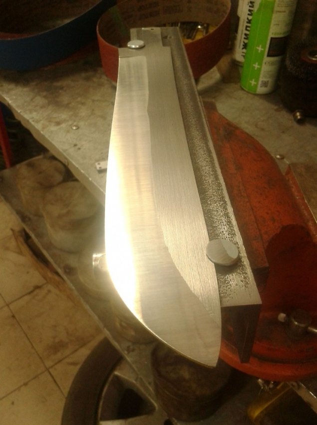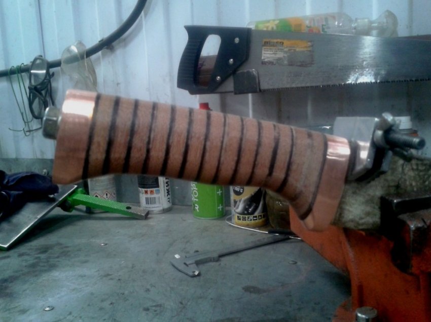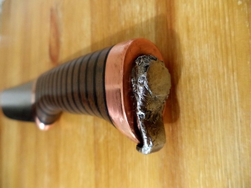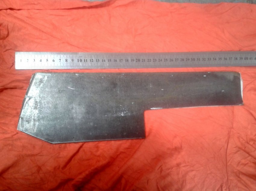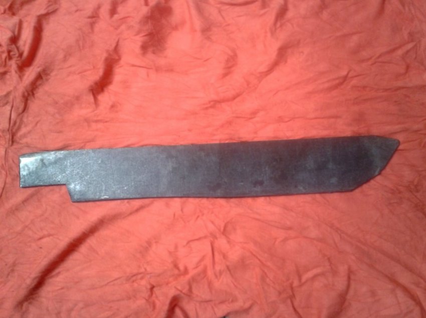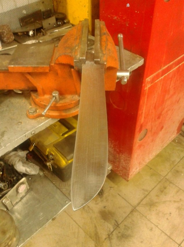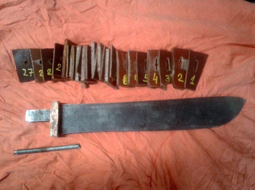 Приветствую всех! Скоро веснище - порище- любвище! Как говорит мой хороший знакомый! А значит рыбалки, походы, шашлыки, вылазки за город! И к знаменованию этих событий изготовил себе "Мачете"! Был у меня остаток мясницкого тесака для разделки туш. Сталь кажется У-7. Точится об любой камень. Прочная и гибкая. Есть отличный топор, но в камышах и кустарниках не очень удобно махать. Всё таки у каждого инструмента свое предназначение. Длина 44 см. Клинок 30 см. Обух клинка 3 мм. Ширина 47 мм. Рукоять 14 см. Набрана: медь, кожа, текстолит, медь, сталь. Эпоксидка. Тёмные пятна на клинке это окисление от разделки мяса, несколько дней мачете было на испытаниях у мясника. Перед этим рубил палеты, канистры из под масла. Испытания продолжаются. Осталось сшить ножны и еще раз заточить.