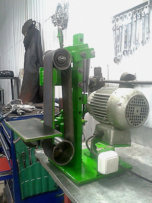 Приветствую всех! После того как собрал себе первый гриндер который был кривой, косой и который не долго прожил по вине напрежения в сети!!!! (Фоток не осталось). Было решено взять органы от старого донора и собрать новый гриндер. На старом был привод ленты сразу от мотора. По этому сделал через ремень и шкивы, итог удачное передаточное число оборотов. Притир, упорный столик, натяжение ленты, сдвиг ленты всё регулируется. Вместо войлочного круга можно устанавливать отрезные круги, щеточныые круги. Мотор Карл Мюллер "Elektror" 1,1 kW 220 В 2800 об.мин. 198-х годов. И офигительный цвет!!!!!