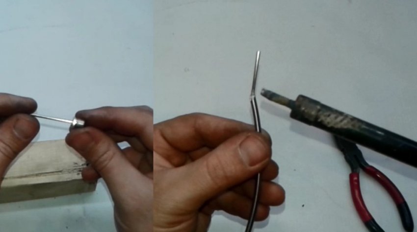 Согнув трубку переходим к соплу. Его я решил сделать из иглы для накачивания мечей. Отрезав головку иглы спаиваем ее с трубкой в положении как на фото.