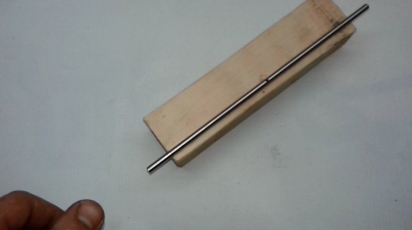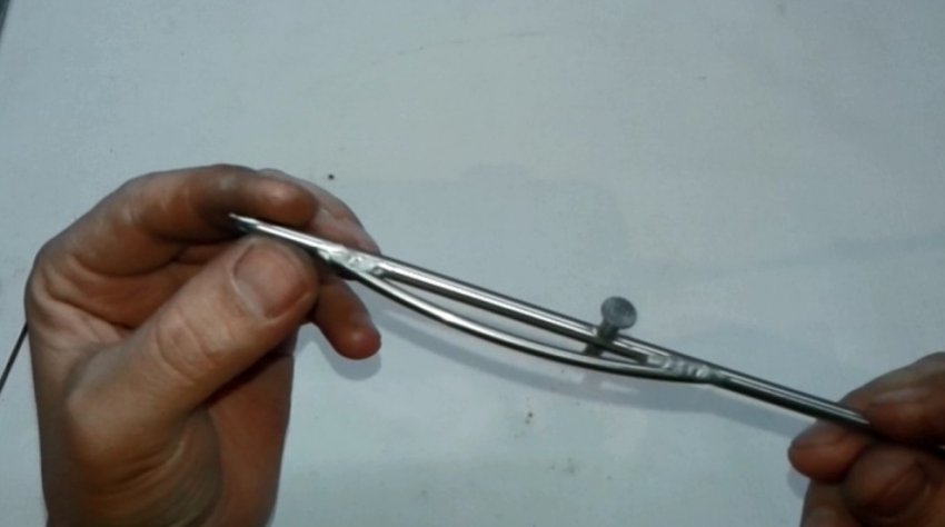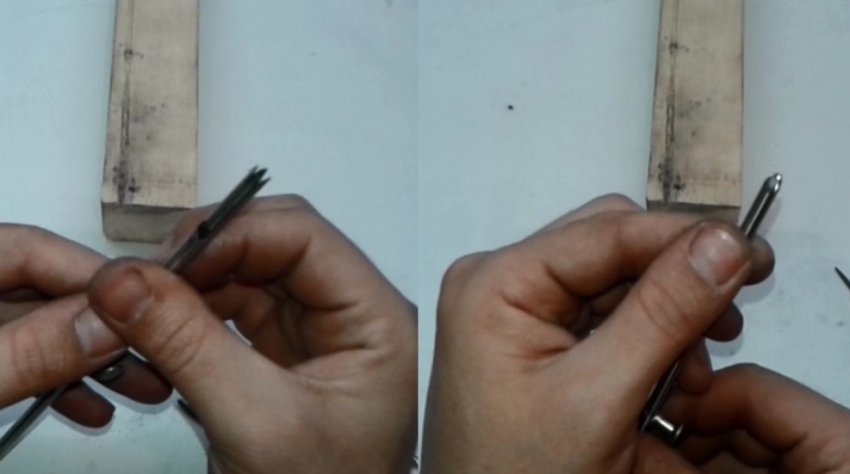 Просверлив отверстие в трубке вставляем в него гвоздь на 120 мм. Это будет вторая деталь краника. Его нужно отрезать на 4 мм длиннее трубки и просверлить в нем отверстие сверлом на 2 мм, на том же уровне что отверстие и на трубке.