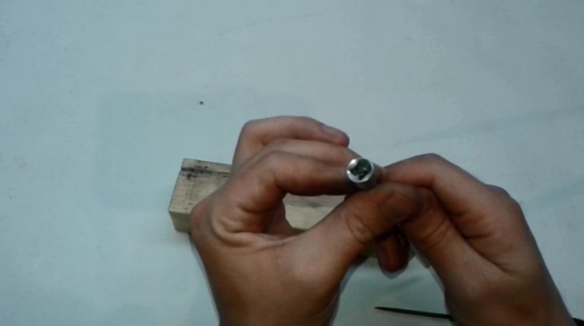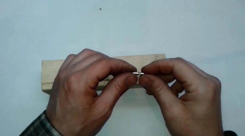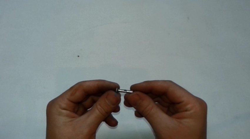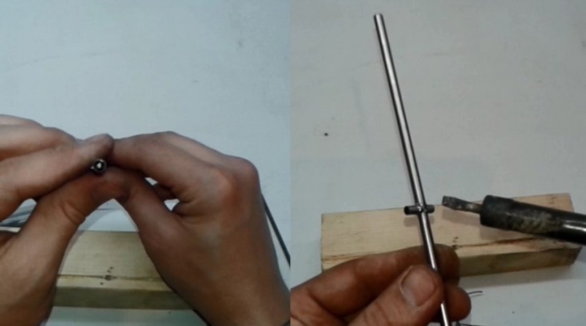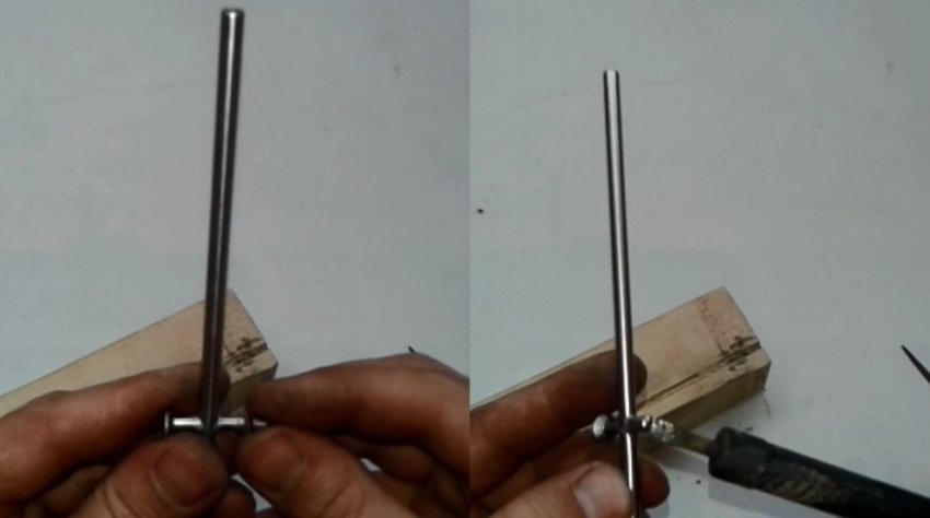 Теперь нужно сделать стопор для гвоздя. От той же средней трубки отрезаем кусочек в 4 мм и припаиваем его к торчащему концу гвоздя.