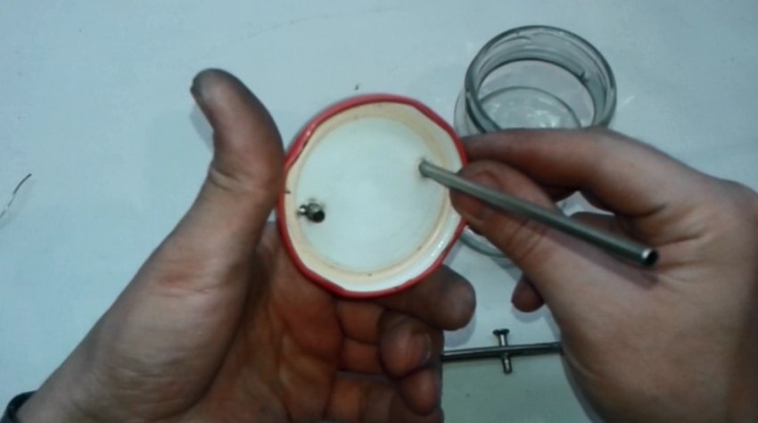 Просовываем трубку в отверстие и оставляем расстояние около сантиметра между дном банки и трубкой. И отступив 2 сантиметра от крышки отрезаем ее. Вторая трубка должна быть короткой, около 2,5 см.