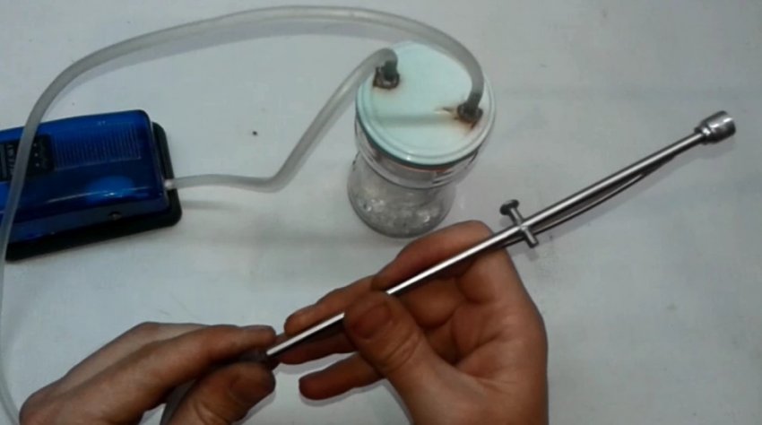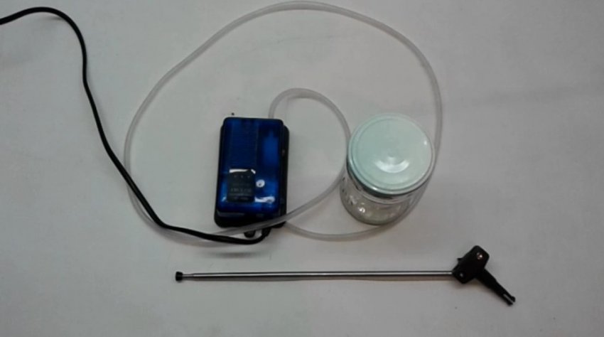 Нам для этого понадобится сама антенна, баночка с накручивающейся крышкой, и воздушный компрессор для аквариумов со шлангом.