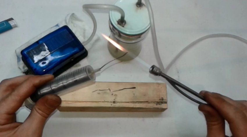 Длинную трубку соединяем с компрессором а короткую с горелкой.