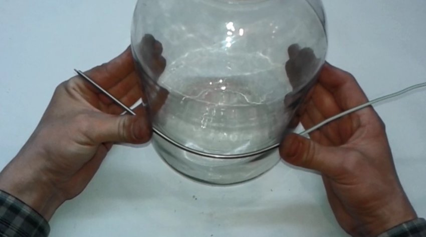 Далее нам нужно немного согнуть самую тонкую трубку антенны. Чтобы она не сломалась, Просовываем в нее провод подходящий плотно по диаметру. И спользуя 3 х литровую банку сгибаем ее
