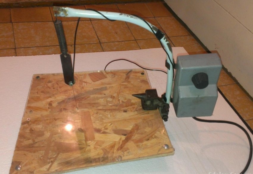 На нее закрепили дугу, на дугу - выжегатель. Также на дугу прикрепили пружину и натянули струну. Провода от выжегателя прикрепили к струне и в принципе аппарат готов к использованию!