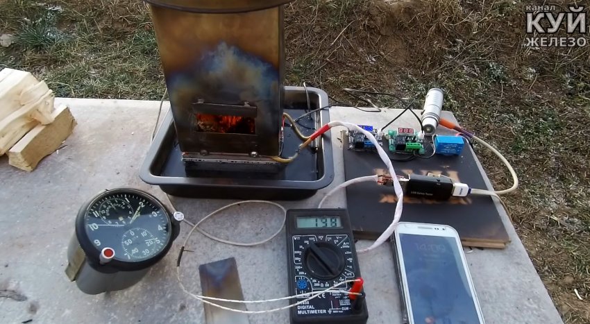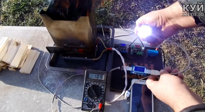 Огонь в печи разгорелся, собранная конструкция начала вырабатывать ток. В качестве потребителей подключались различные девайсы. Отлично работает 10-ти Ваттный светодиодный фонарик. Проверен на всех режимах. С менее мощным mp3 плейером тоже никаких проблем. И при подключении к нему маломощного усилителя с динамиком звук был достаточно громкий, не прерывался. За время тестирования был заряжен сотовый телефон с 50 до 100 % заряда.