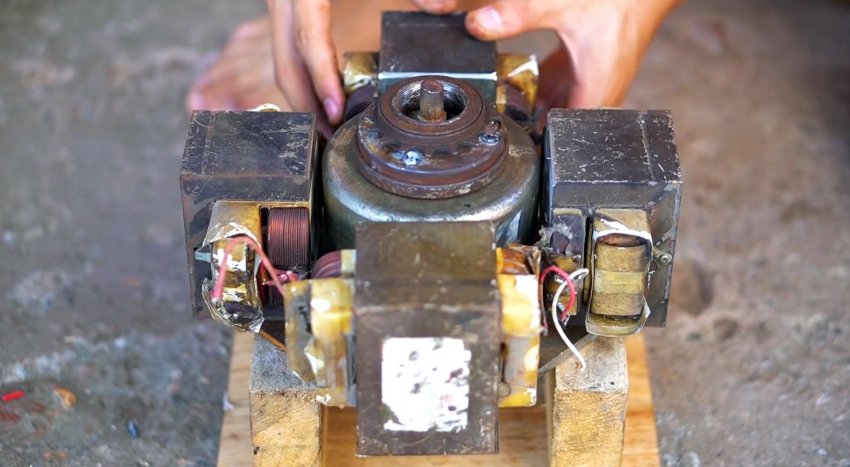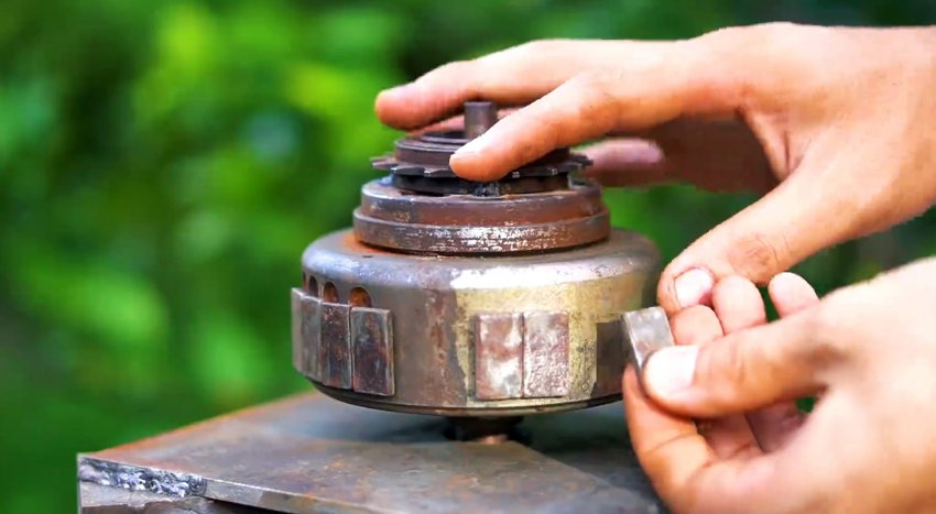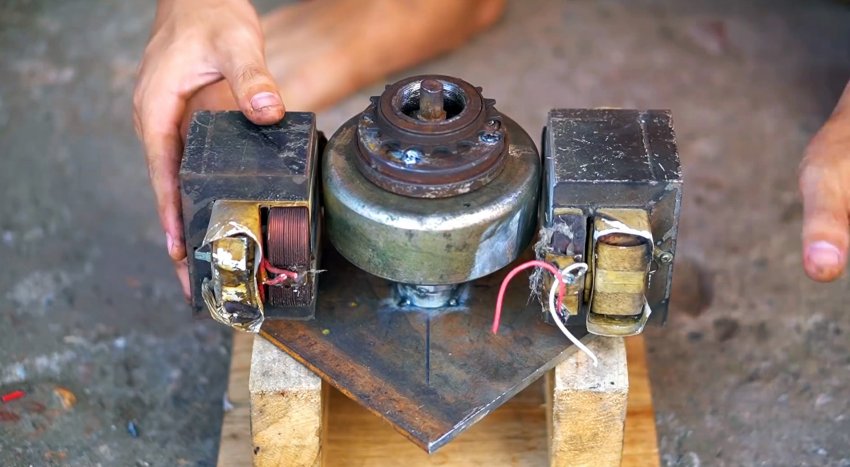 На подшипники устанавливается вал. На него приваривается тяжелый маховик. Это может быть сердечник ротора от электродвигателя или что-то подобное.
