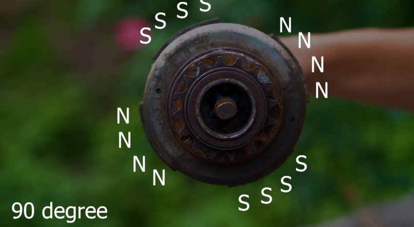 Теперь нужно установить на ротор 16 магнитов. Они размещаются по 4 шт. Важно чередовать полярность между группами.