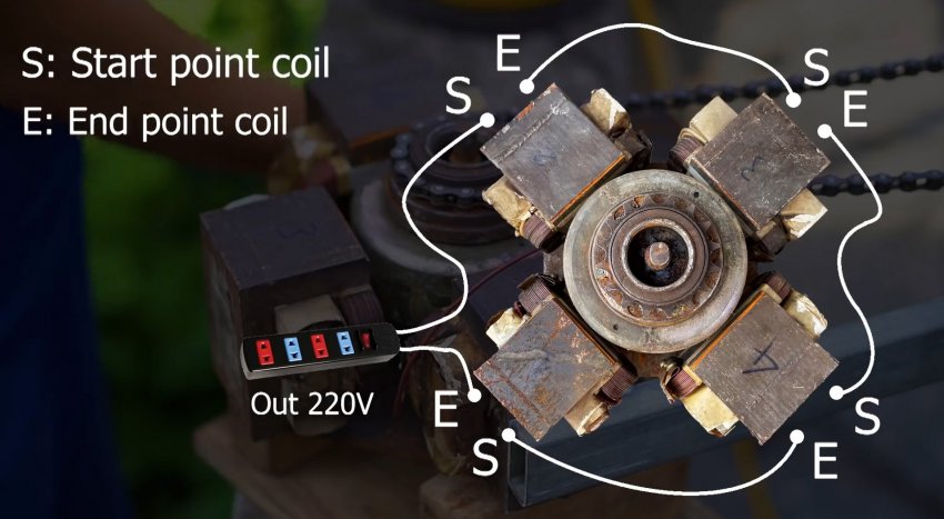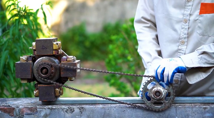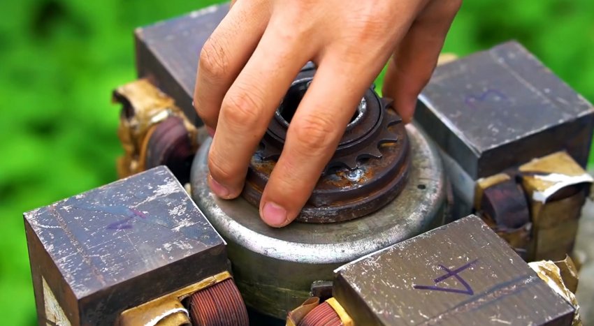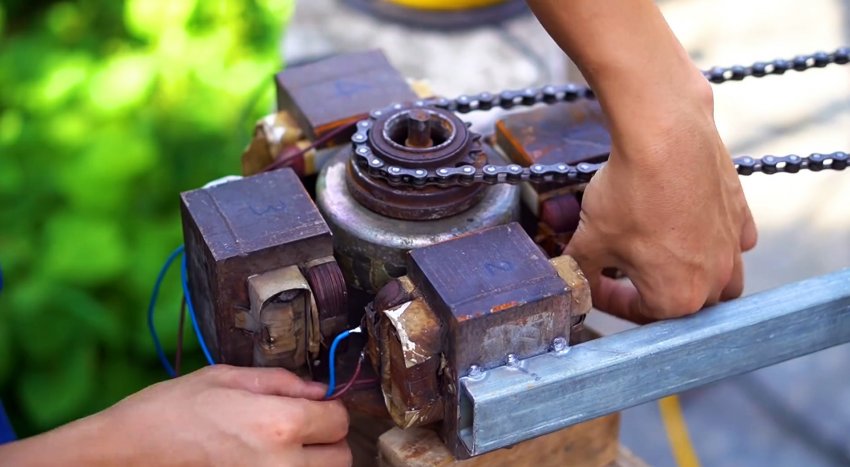 Ротор с магнитами устанавливается на подшипники. Затем нужно приварить штангу с профильной трубы к одному из трансформаторов. После этого на другой конец штанги приваривается каретка, и между звездочками натягивается цепь.