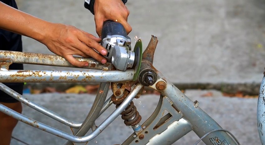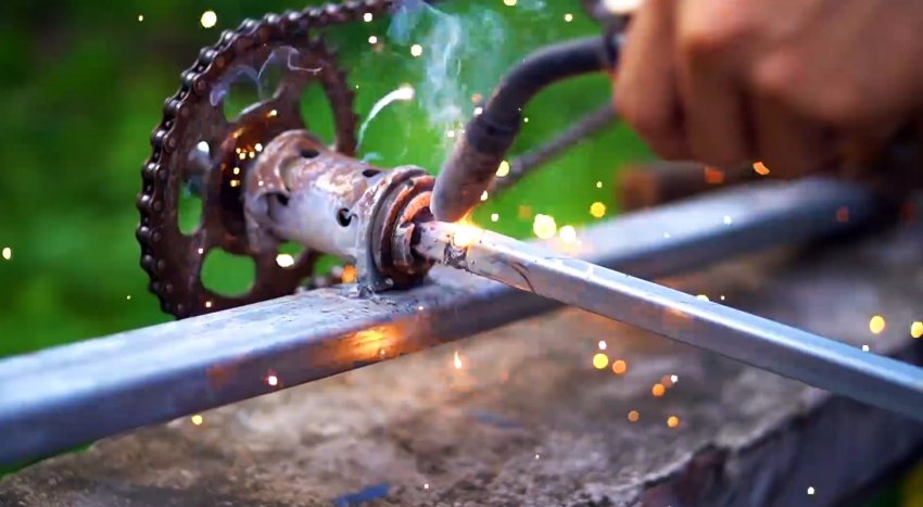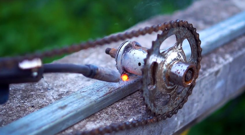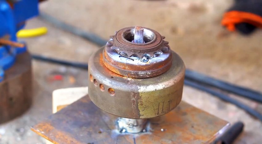 Далее требуется отрезать от рамы велосипеда каретку вместе с картриджем. На ней должна остаться ведущая звезда. Также из велосипеда снимается задняя звездочка с трещоткой, и цепь. Последняя приваривается на ротор.