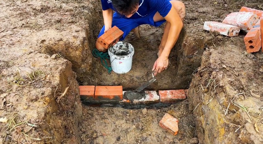 Далее прорываем у ручья обходной канал от основного течения, по которому будет пущена вода для съема энергии. До его соединения с руслом, из кирпича и раствора в траншеи выстраивается плотина с небольшим шлюзом под канализационную трубу.