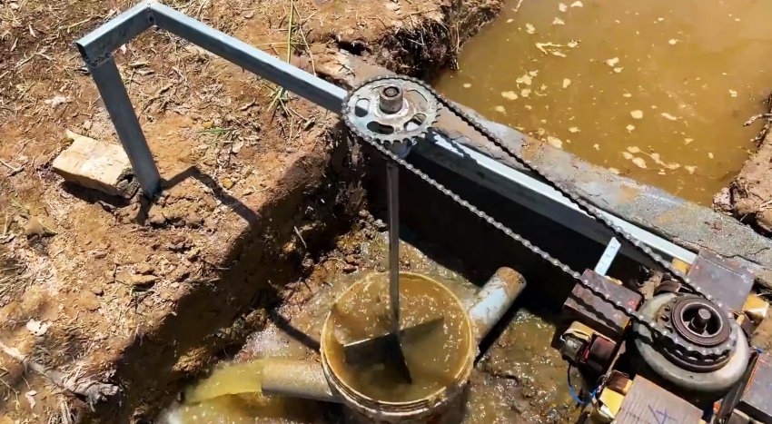Затем из ведра и канализационных труб необходимо сделать улитку. Это нужно, чтобы вода входила в ведро по одной трубке, закручивала лопасти ГЭС, и выходила. В улитку вставляется крыльчатка генератора, он сам закрепляется на столбиках сверху. Таким образом, электрическая составляющая располагается в стороне от мокрой зоны.