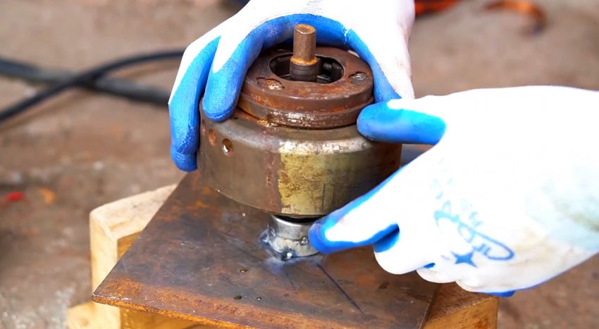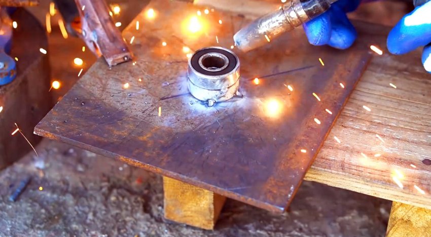 Центр пластины просверливается, и сверху привариваются за внешние обоймы пара подшипников.