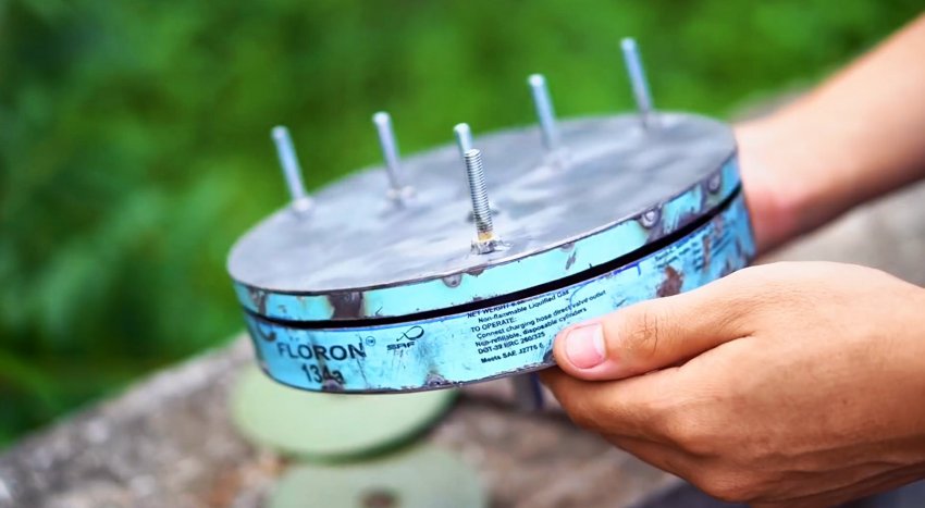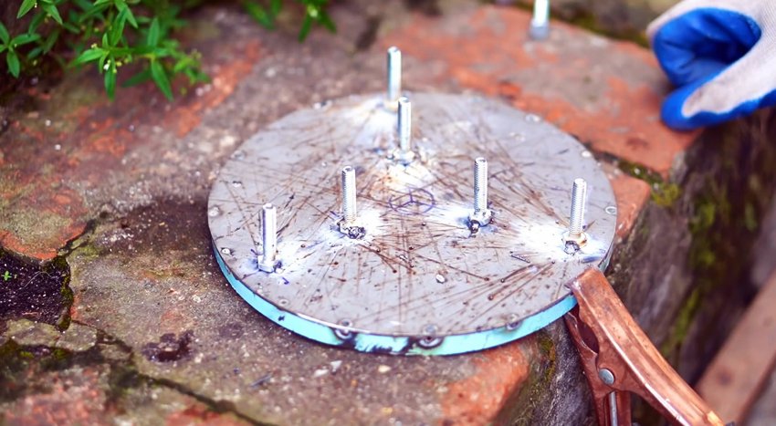 Вторая заготовка будет использована для ротора. Ее необходимо разделить на 3 равные сектора, и на полученных линиях приваривать по 2 болта, чтобы крепить лопасти.