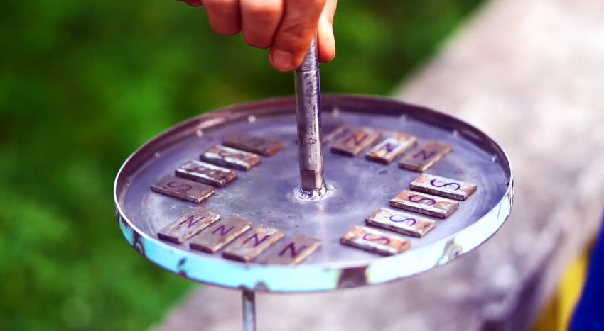 Статор и ротор разбираются обратно. Внутри последнего размещаются постоянные магниты. Их нужно расположить на 4 стороны по 4 шт. Каждая группа помещается с чередованием полярности.