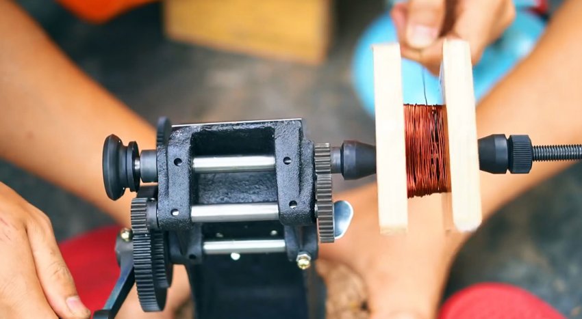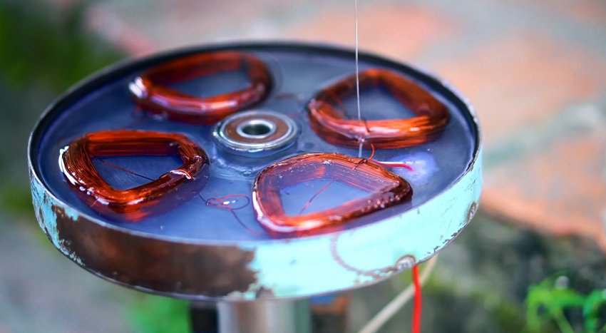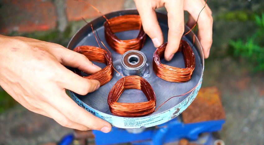 Чтобы закончить статор, необходимо сделать 4 намотки медного провода по 300 витков. Полученные катушки укладываются в него, и спаиваются между собой последовательно. Их концы выводятся к проводу.