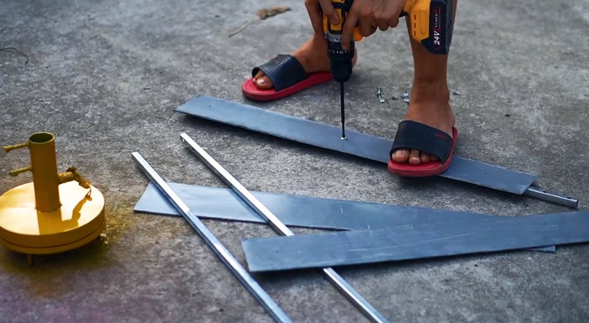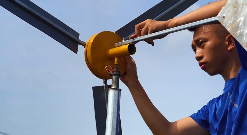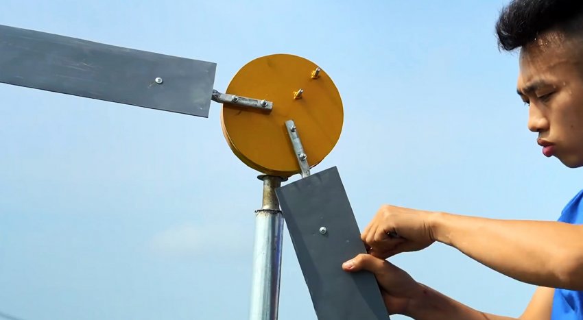Генератор устанавливается на веху таким образом, чтобы свободно вращается по оси. Затем на него прикручиваются лопасти. Хвост для улавливания направления ветра делается из отрезка профильной трубы, а его лопатка из листового металла.