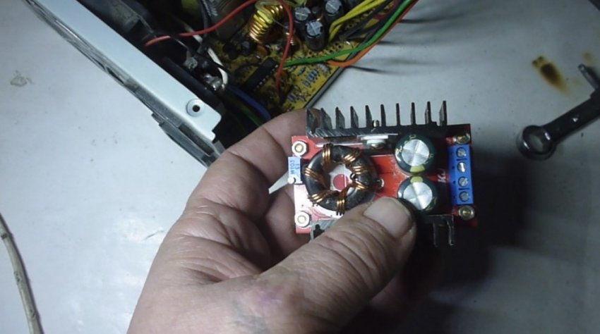 -Подключенный через монтажные провода повышающий преобразователь напряжения разместить и зафиксировать в блоке питания.