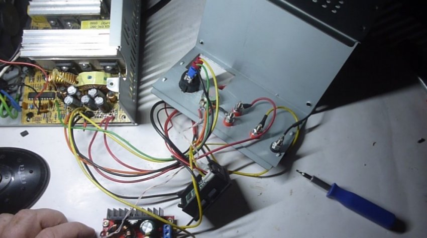 Как собрать регулируемый блок питания? Вы узнаете прочитав эту статью и посмотрев видео инструкцию. Часто у людей не имеющих теоретической и практической подготовки работы с электрическими приборами, возникает необходимость в приборе способном запитать электрические машины и потребители. Как быть? Собрать данный блок питания. Он не отличается очень высокими техническими данными, важными для радио любителя, но ему под силу выполнить многие задачи по запитке различных электроприборов. Кто любит смотреть, а не читать вам видео инструкция. Инструменты: -Сверлильный станок или дрель. -Сверла. -Напильник или надфиль. -Наждачная шкурка. -Канцелярский нож. -Гаечные ключи. -Паяльник. -Отвертки. -Пассатижи или плоскогубцы. -Отрезная машинка. Расходные материалы: -Болты и гайки. -Монтажные провода. -Повышающий преобразователь напряжения. -Вольтамперметр 100В, 10А. -Припой. -Паяльная кислота. -Выключатель. -Переменный резистор. Порядок изготовления: -Выпаять из старого компьютерного блока питания связки лишних проводов, оставить черный минус питания, желтый 12В плюс, оранжевый 3.3В плюс, красный 5В плюс, и зеленый для включения. -На лицевой панели блока питания высверлить и отверстия для монтажа приборов контроля, ручек управления и разъемов снятия напряжения с прибора. -Выпаять из повышающего преобразователя напряжения подстроечный резистор, на его место впаять переменный резистор десять ком. -Провести пайку проводов блока питания, подробно показано в видео ролике. -На лицевой панели разместить и закрепить вольтамперметр, ручку управления, выключатель и разъемы снятия напряжения. -Подключить подготовленные провода как указано в видео ролике. -Подключенный через монтажные провода повышающий преобразователь напряжения разместить и зафиксировать в блоке питания. -Собрать корпус блока питания. -Подключить блок питания к сети 220 Вольт. -Щелкнуть тумблером включения прибора и проверить работу под нагрузкой. На сегодня это все друзья. ЛБП СВОИМИ РУКАМИ пошаговая инструкция Доступно всем Собрать блок питания