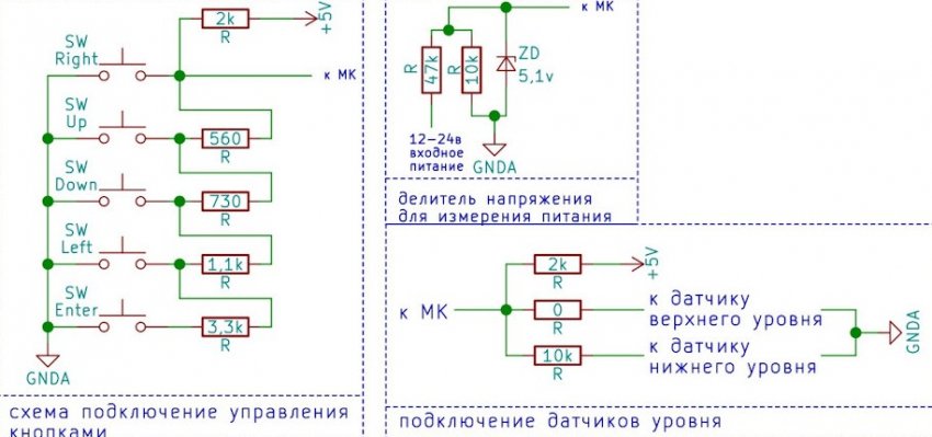 3 входных pin процессора задействуем для подключения 5 кнопок, датчика уровня и вход для измерения входного питания. Считываемые значения АЦП, распределяем программой. Между входом МК и Gnd, порта АЦП для замера входного питания, устанавливаем в качестве защиты порта стабилитрон на 5 вольт.