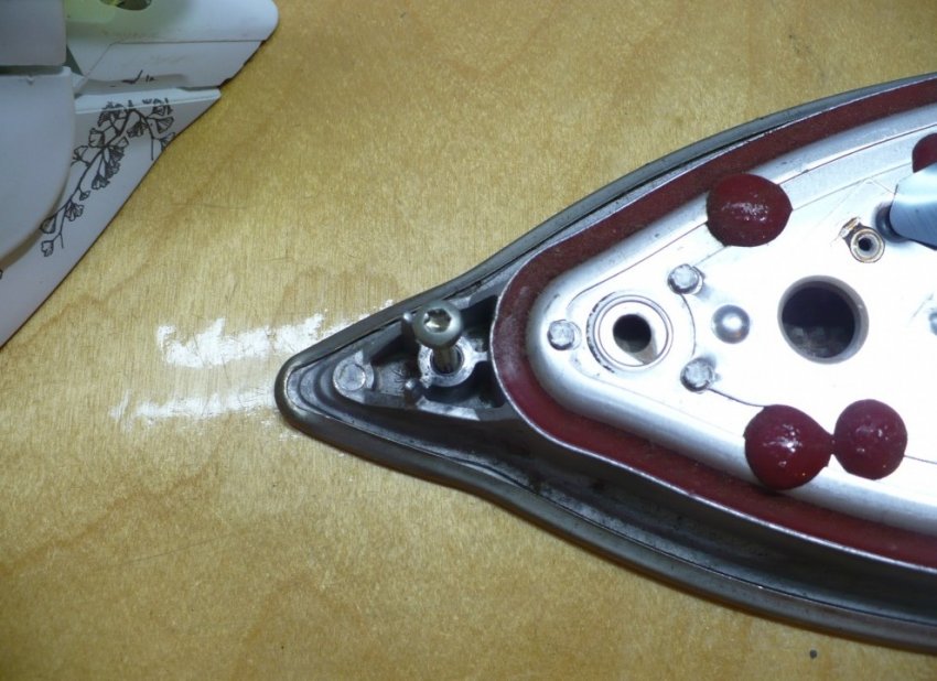 Дал время подсохнуть по инструкции-тут главное не передержать-по тому как я отвлекся на фото и видео съемку и герметик у меня взялся коркой.Потом при последующем монтаже-выдавились шарики (если внимательно глянуть в видео их видно)-во внутрь утюга-но к радости на качестве ремонта это не отразилось.