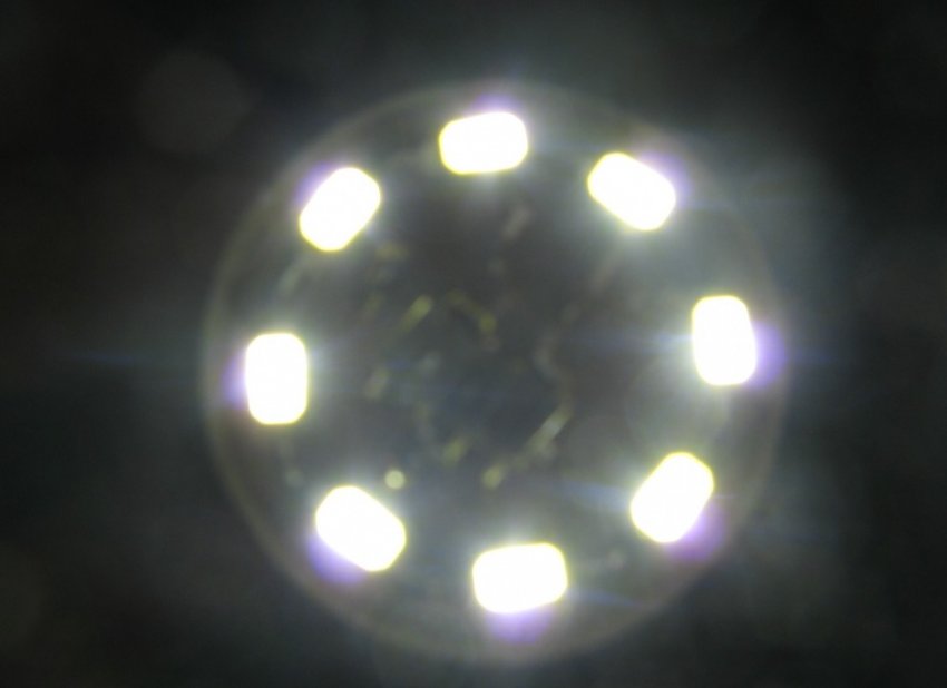Включаем через предохранитель и потом меряем ток. У меня получилось 34мА. Т.е. потребление лампы около 7.45 ватт. Сколько по свету, сказать точно не могу, померить увы нечем, но думаю больше 3 ватт.