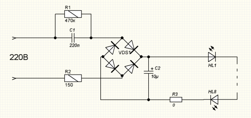 В данной схеме конденсатор С1 выполняет роль ограничителя тока, R1 разрядный резистор (необходим для разряда конденсатора после отключения схемы от сети). Резистор R2 выполняет роль защиты, точней ограничитель бросков тока во время заряда конденсатора C1. Диодный мост, у меня 4-е диода собранные в мост, выполняют роль выпрямителя из переменного тока в постоянный. Конденсатор С2, сглаживающий пульсации выпрямленные диодным мостом, можно поставить и емкостью побольше, у меня какой был, я его и поставил. Напряжением он должен быть максимально возможным. Был случай обрыва линейки светодиодов и напряжение на конденсаторе поднялось и последний рванул. Резистор R3 указал с нулевым сопротивлением, его можно вообще не ставить, если ток вас устраивает. Светодиодов у меня будет в районе 8 штук.