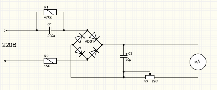 Зависимость тока, от емкости гасящего конденсатора, проверял по простой схемке. Она же схожа с окончательной схемой светодиодной лампы. Единственное что могу отметить, это регулируемый резистор R3. Им гасил излишки тока. Это для случая если у вас есть например конденсатор емкостью 1 мк и тока вашей линейке светодиодов многовато.