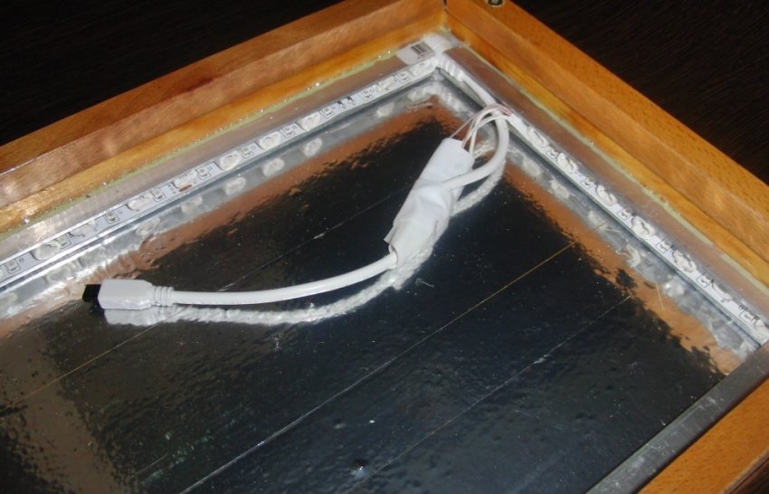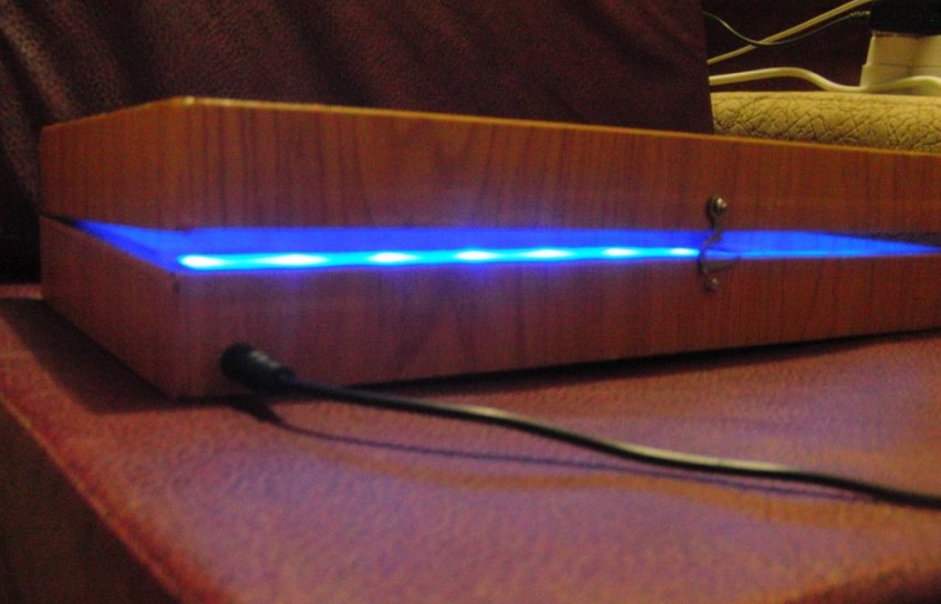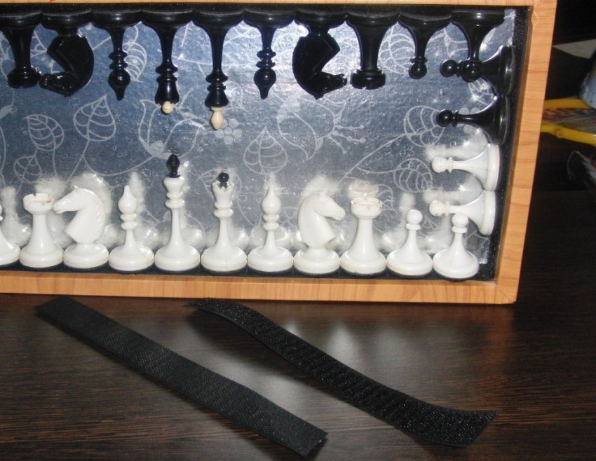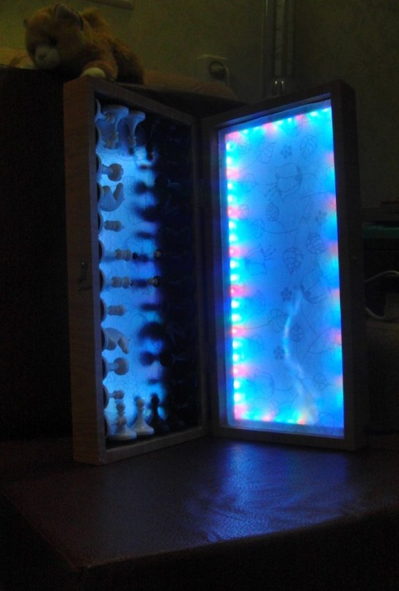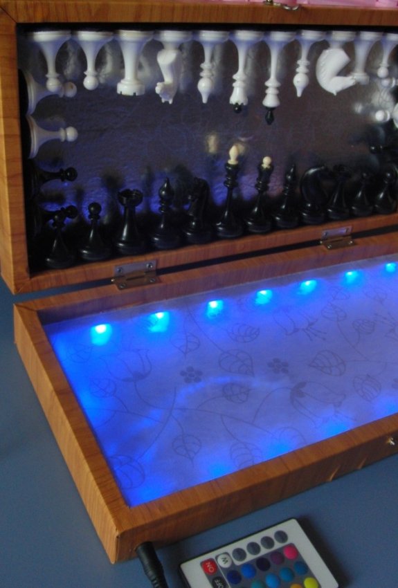 На одну из половинок шахматной доски по периметру наклеиваем липучку для одежды - "крючок", а ворсистую часть приклеим на подошвы шахматных фигур. Теперь мы легко можем закреплять фигуры внутри доски. На второй половине доски устанавливаем алюминиевый профиль с встроенной светодиодной лентой внутри, управлять которой можно с пульта, легко меняя цвета ночника. На профиле закрепляем матовое стекло. Для безопасности на стекло можно наклеить прозрачную самоклеющуюся плёнку с небольшим рисунком. Светильник-ночник готов! Уменьшить яркость освещения можно ещё просто чуть прикрыв крышки шахматной доски.