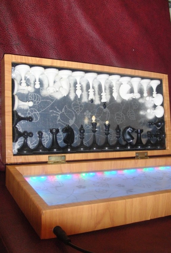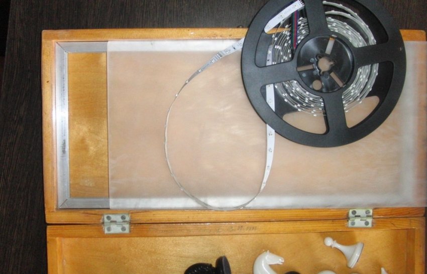 Делаем оригинальный ночник из шахматной доски. Ночник - незаменимый атрибут комнаты, и сделать его не похожим на все остальные помогут шахматы. Старые шахматы займут достойное место на нашем столе уже в новом облике . Для сборки нам потребуется: - шахматная доска с фигурами, - алюминиевый профиль (п - образный), - контроллер с пультом управления, - липучка для одежды, - матовое стекло или оргстекло, - самоклеющаяся плёнка, - металлизированный скотч.