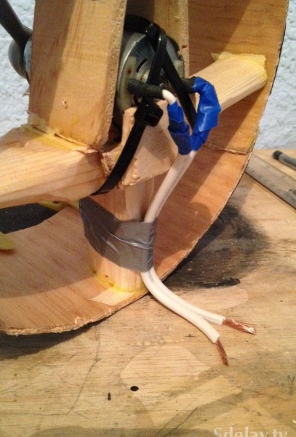 Припаяйте два провода сечением 14 к двигателю. Заизолируйте изолентой. Чтобы провода не попали в лопасти, закрепите их на опоре вентилятора.