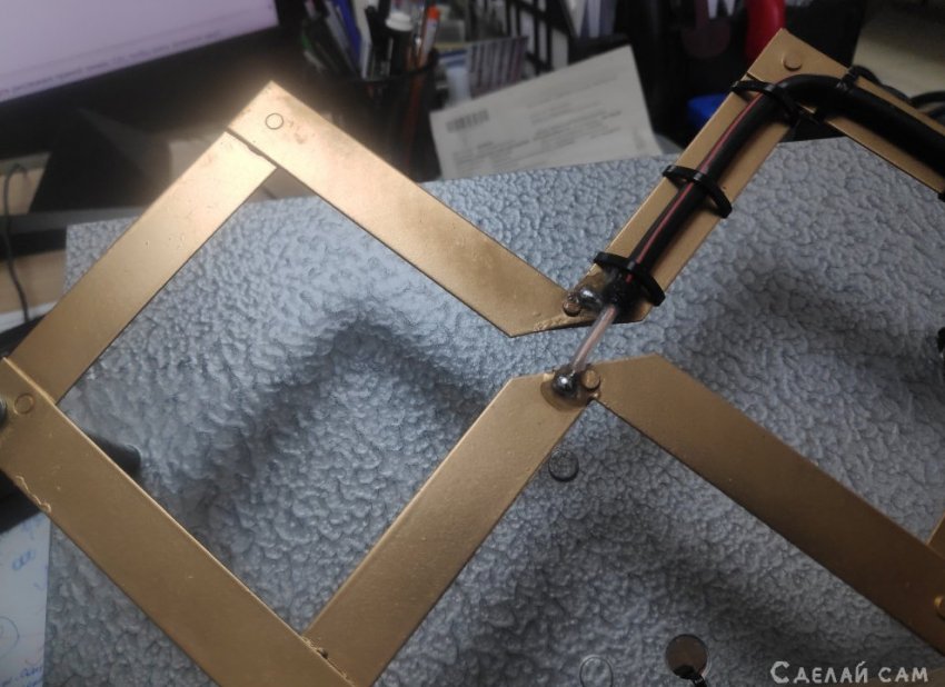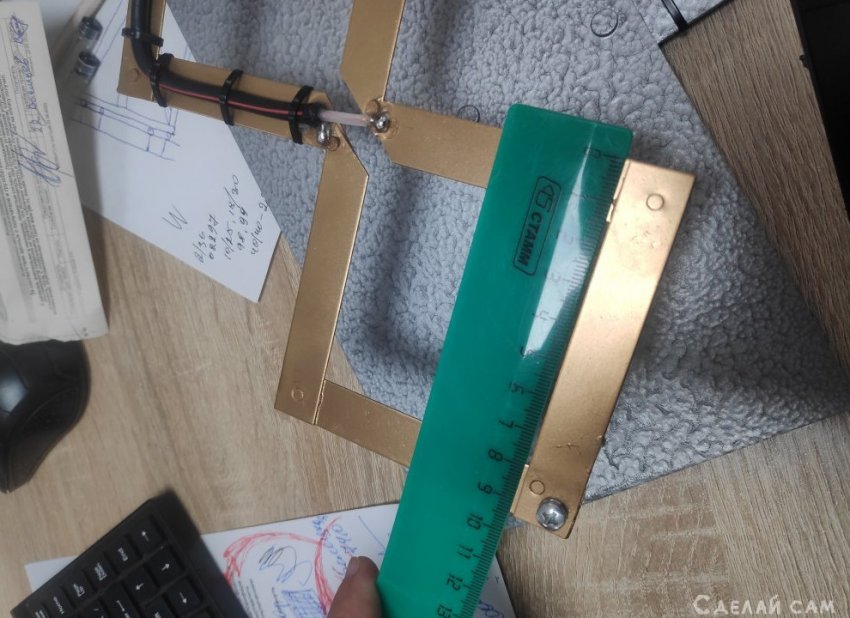 Антенна представляем собой сдвоенные 2 квадрата пластин, лучше сделать из меди, со стороной 9,5 см. Ширина пластины 15мм. Вырезаем пластины, м как показано на фото склепываем между, и в идеале, пропаиваем все стыки.