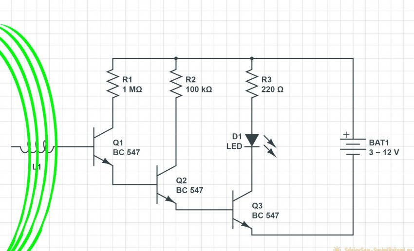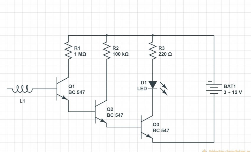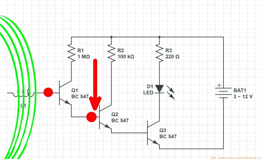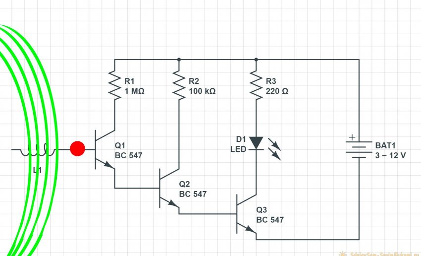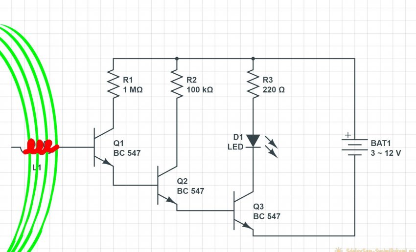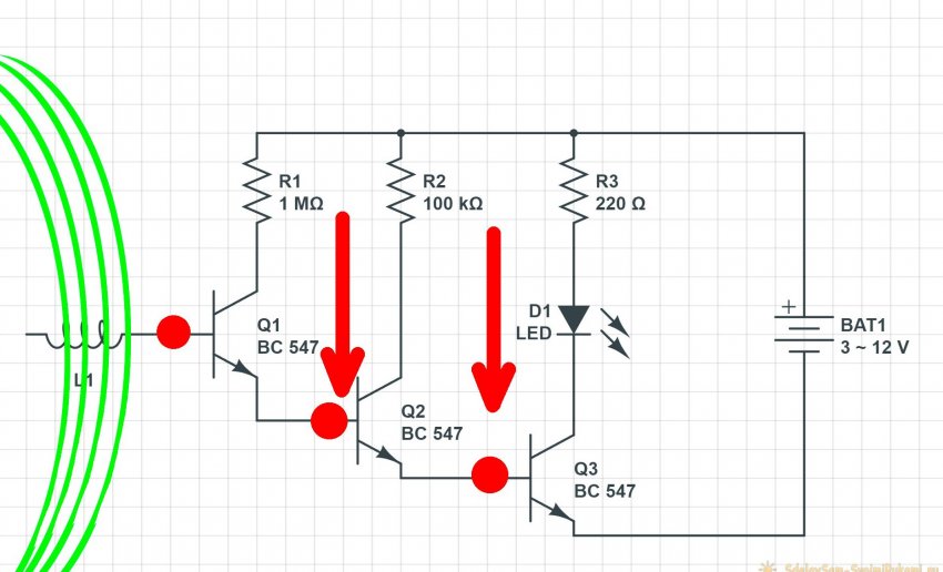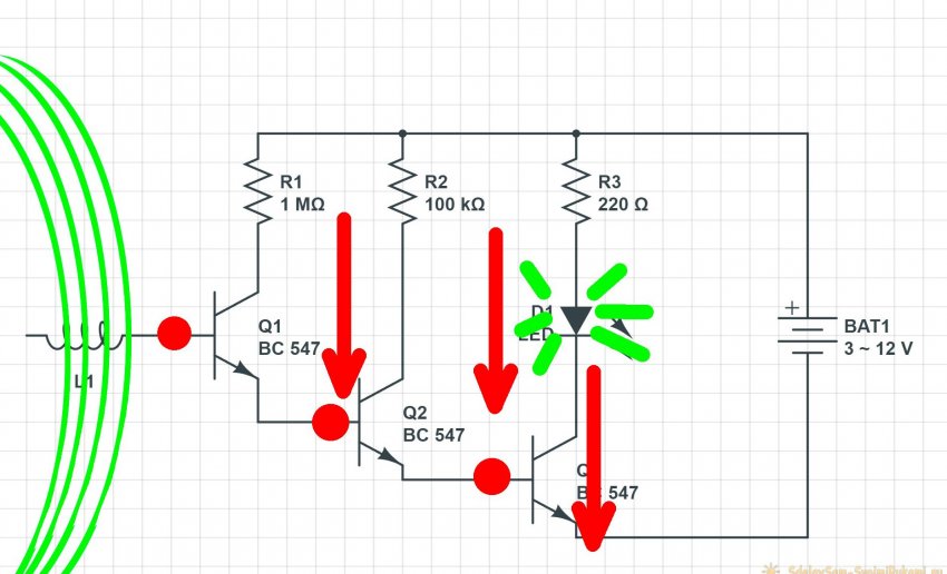 Схема прибора довольно проста: она состоит из трёх резисторов на 1 МОм, 100 кОм и 220 Ом (обведены красным), трёх NPN транзисторов BC 547 (На самом деле подойдут любые NPN транзисторы) одного светодиода, одной катушки на 10-15 витков и батарейки от 3 до 12 вольт.