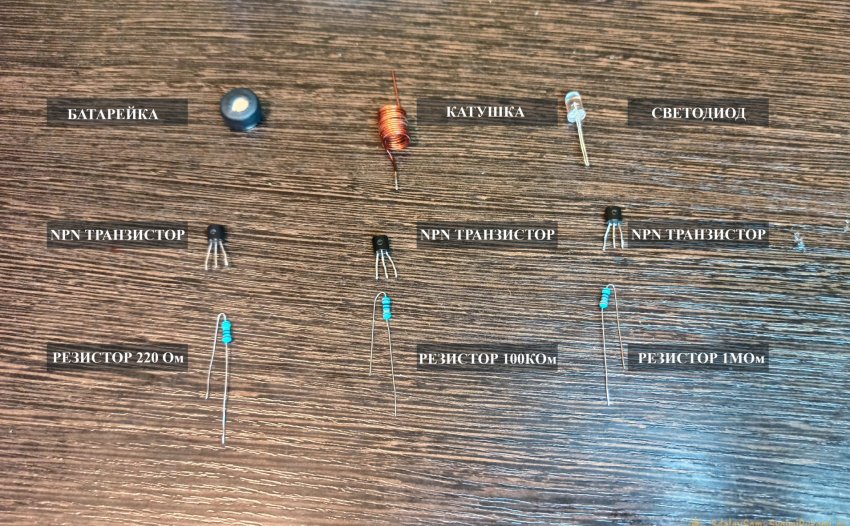 - Резисторы: 1 МОм, 100 кОм и 220 Ом.