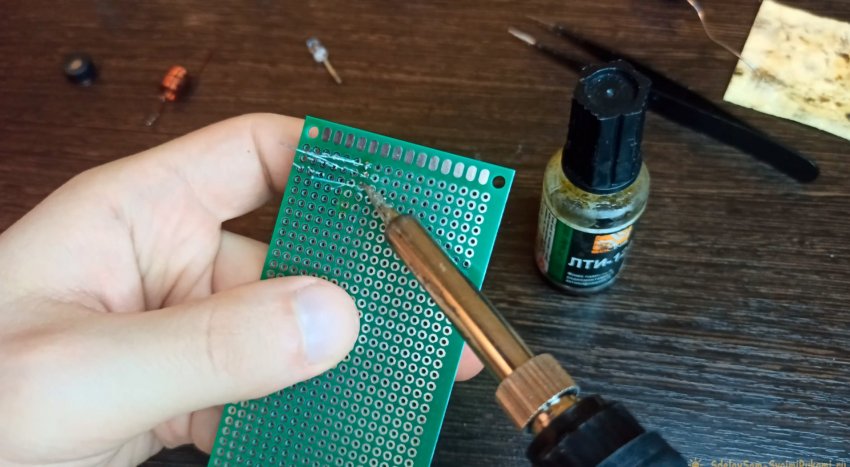Припаиваем детали к дорожкам, а затем откусываем всё лишнее. Теперь подготавливаем проводки для светодиода и батарейки: зачищаем, лудим (покрываем тонким слоем припоя).