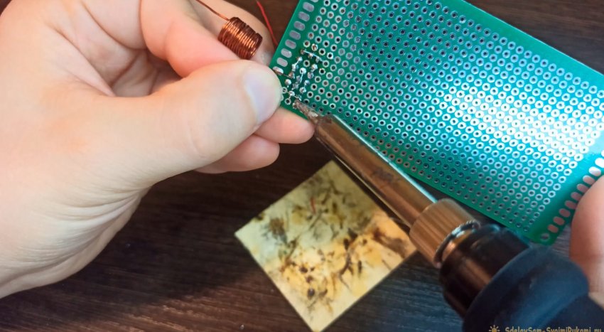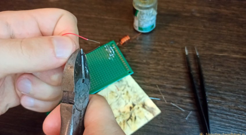 Обычную эмалированную проволоку наматываем на карандаш в форме катушки, а затем припаиваем к нашей схеме. После отгибаем в сторону контакты резисторов, так, чтобы они образовали дорожки.