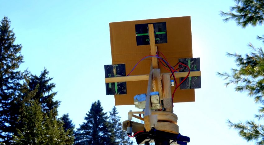 Для этого прототипа просто использован кусок картона для создания затенения солнечных панелей. Но это не имеет значения, функция отслеживания работает одинаково со всем, что отбрасывает тень. Необходимо подобрать размер экрана, создающего тень и расстояние панелей от него так, чтобы он закрывал их своей тенью, когда устройство правильно выравнено по солнцу. Но как только солнце смещается на определенное расстояние, тень смещается вместе с ним. Солнечная батарея обнажается, включается один из двигателей и трекер поворачивается за солнцем. Освещенная солнечная панель снова оказывается в тени, она перестает вырабатывать ток для вращения двигателя, и вся конструкция останавливается. Чем дальше эти панели находятся от объекта перед ними, тем точнее этот трекер будет следовать за солнцем, потому что они будут подвергаться воздействию солнечного света под меньшим углом.