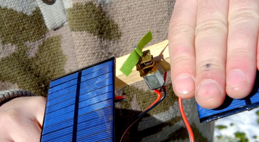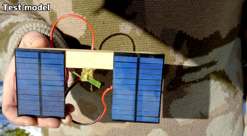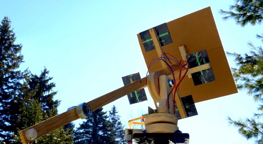 Вместо того чтобы использовать датчики освещенности и компьютер для обработки информации с датчиков, здесь применены крошечные солнечные панели для непосредственного запуска небольших электродвигателей. Если одна из солнечных панелей подвергается воздействию солнечного света, она вырабатывает достаточно энергии, чтобы привести в действие один из этих крошечных электромоторов, который вращается на поворотной панели до тех пор, пока солнечная панель не окажется снова в тени, в результате чего двигатель выключится. Всего в модели используются два двигателя – один для поворота в горизонтальной плоскости, а другой для наклона его вверх и вниз.