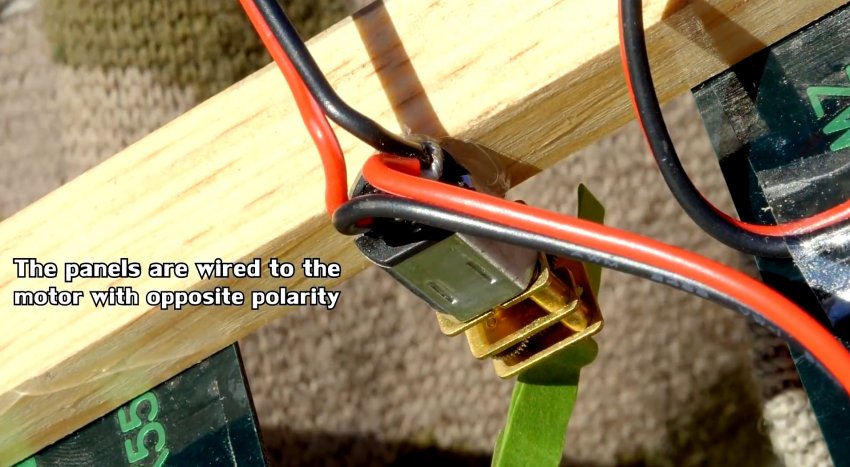 Двигатели следует использовать реверсивные, т.е. изменяющие направление вращения в зависимости от полярности приложенного к ним напряжения. Каждый двигатель подключен к двум солнечным панелям в одной плоскости так, что его ось вращается в одном направлении, когда одна из панелей освещена, и в противоположном, когда засвечена другая.
