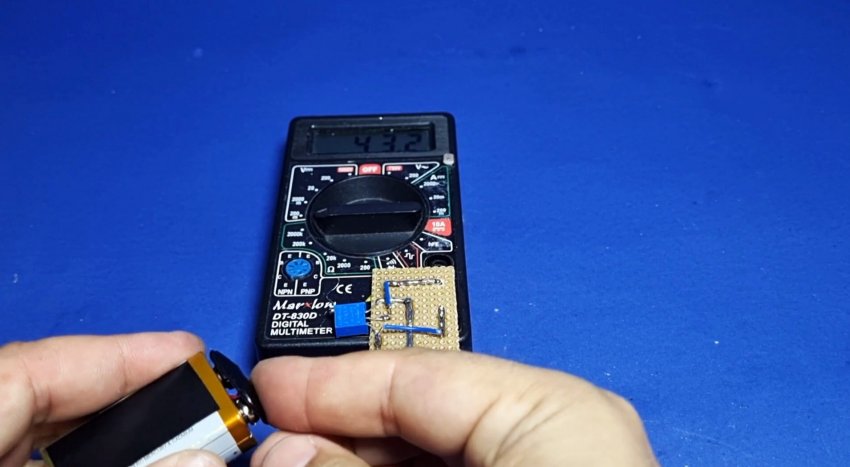 Подключаем питание от батарейки типа «Крона». Мультиметр устанавливаем на измерение постоянного тока «200 мВ».
