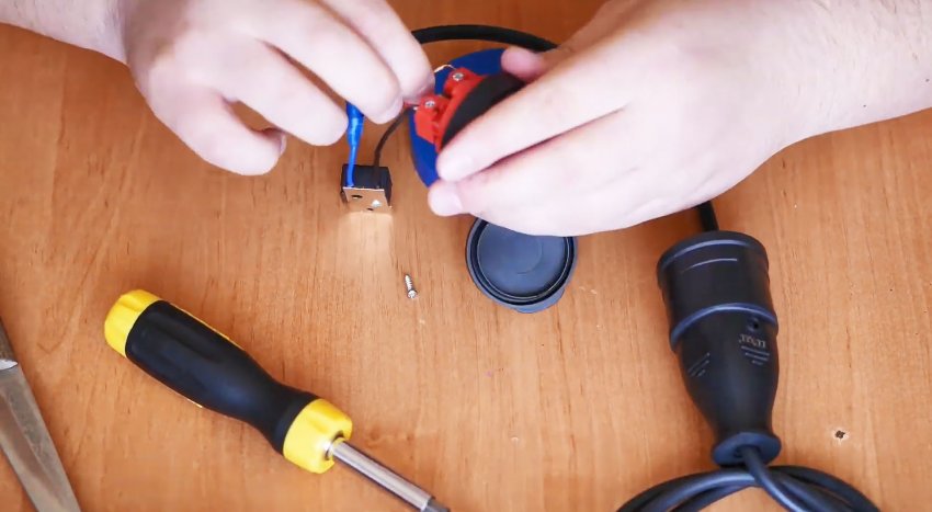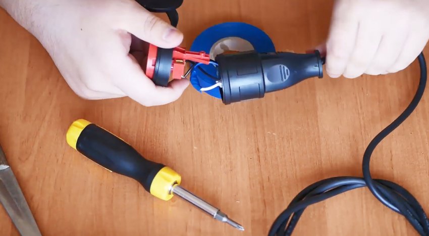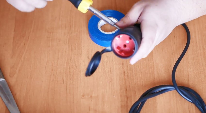 Для изготовления удлинителя необходимо разобрать корпус кабельной розетки. В него с обратной стороны пропускается сетевой шнур с вилкой. Один провод сетевого шнура скручивается с проводком плавного пуска. Затем к одному контакту розетки подсоединяется оставшаяся жила от кабеля, а ко второму от блока плавного пуска. Соединения изолируются. Для надежности скрутку лучше перед этим спаять.