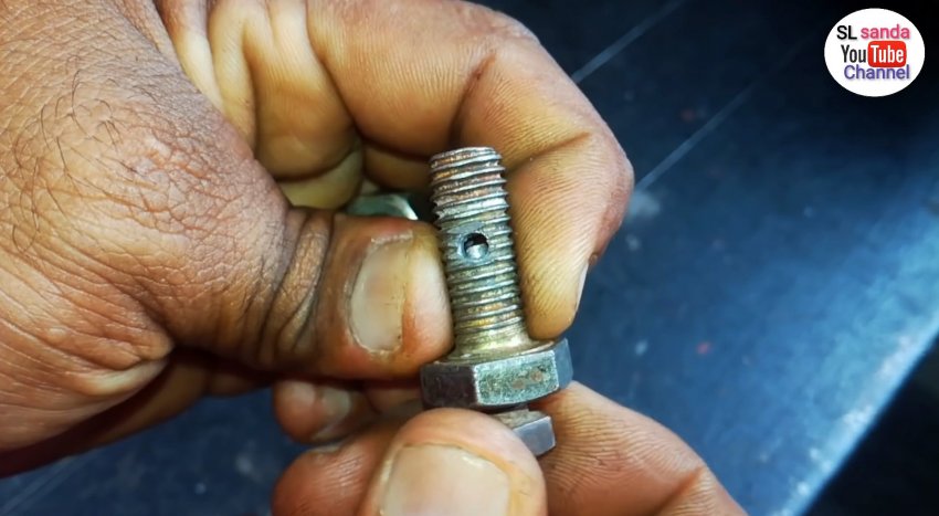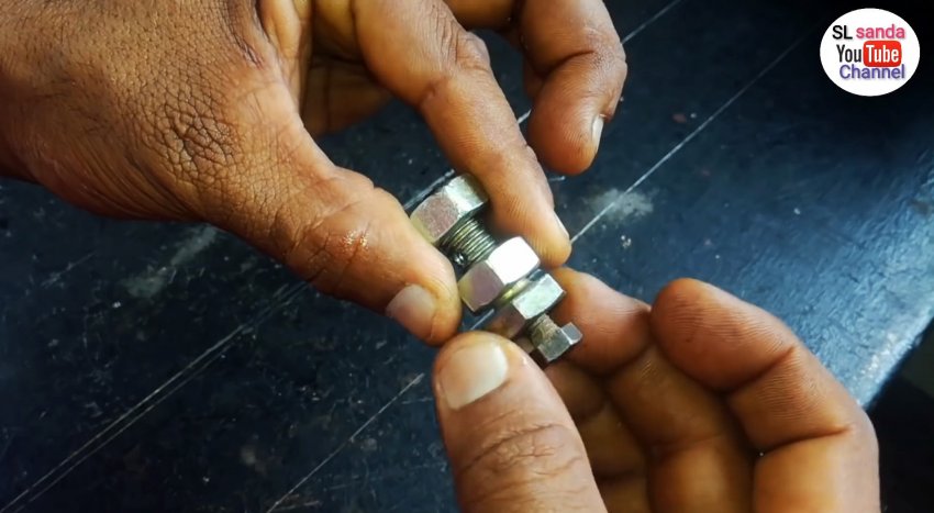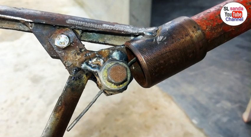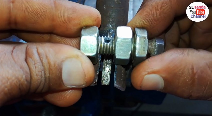 На рычаг нижней ручки нужно закрепить крепление троса. Оно делается из просверленного вдоль болта с нарезанной резьбой под винт. Последний закручивается, и вместе с болтом просверливается поперек под диаметр троса. На крепление наживляется 3 гайки. Затем с помощью двух оно приваривается к рычагу.