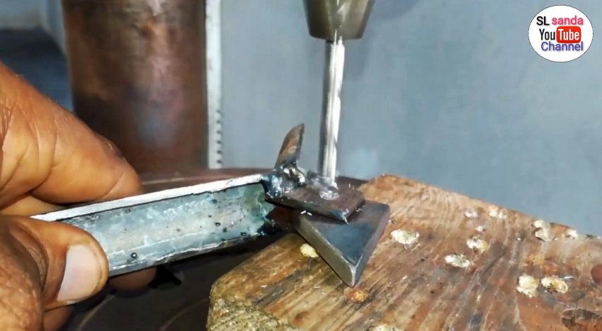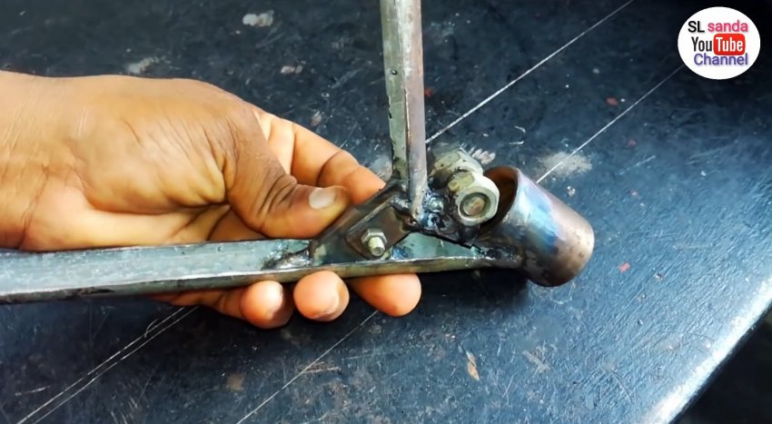 На внутренний угол детали приваривается 2 проушины из полосы. Между них располагается флажок, вырезанный из толстого листового металла. Затем они просверливаются, и соединяются болтом.